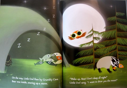 Like a child who flits from one parent to the other looking for attention, Little Owl is anxious to share his love of the night with every animal he meets. And his enthusiasm is contagious, especially as he tries to rouse the snoring bear in his cave to show him the moon (“He wondered if the bear had ever seen stars!”).