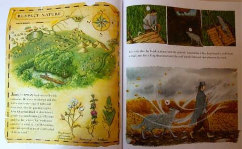 Enter Johnny Appleseed, that larger-than-life figure who was allegedly responsible for planting and distributing the seeds for many of our country’s apple trees (that’s right, boys and girls, that apple you’re eating might have descended from a seed this guy planted!). September 26 marks the birth of Johnny Appleseed (whose real name was John Chapman). Last year at this time, I searched the libraries for a book about Chapman to bring to JP’s school; but while there are no shortage of kids books written on this topic, most struck me as inaccessible—a portrait of an historical figure presented without any meaningful context.
