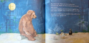 A yawning Bear wants to settle in for his winter repose, but first he “has a story to tell.” Naturally, telling a story requires an audience, but all Bear’s friends—Mouse and Duck and Mole and Frog—are too busy prepping for their own hibernation (or migration) to listen. Unlike my five year old, Bear is a patient and empathetic soul: he doesn’t stomp his feet in frustration; he knows his friends will be ready when they’re ready. Or maybe he just knows that a good storyteller must work carefully to set his stage.
