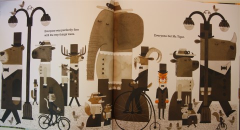 One of the marks of a great picture book is when the text and the illustration add up to a sum greater than their parts—when children have to engage with both elements to grasp the full meaning. This means that some of the most impacting picture books for kids have the fewest words (Paul Zelinsky’s Z is for Moose from a previous post is another great example of this). Mr. Tiger Goes Wild begins simply enough: “Everyone was perfectly fine with the way things were. Everyone but Mr. Tiger.” A close look at the double page spread reveals that Mr. Tiger is not simply disgruntled but ready to blow. In addition to being the only animal pictured in color (a fiery orange), he is the only one with open eyes (a piercing green that stares directly at us); all the others look as if they are sleepwalking through their day, unemotional and dressed identically in drab Victorian attire.
