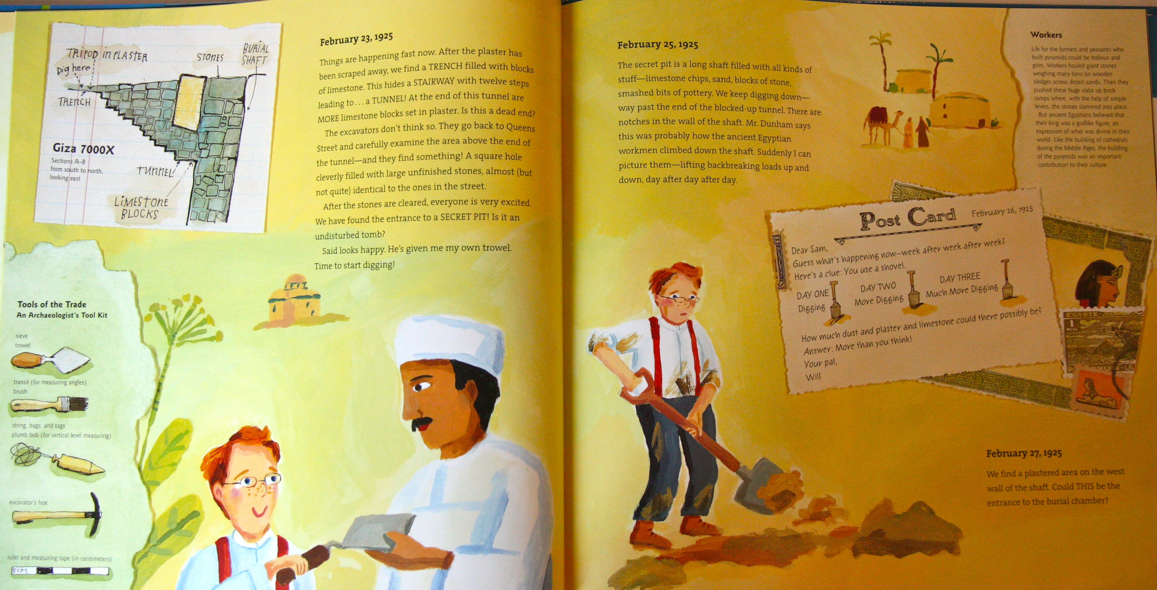 The real magic here is the mystery—a mystery that begins with the owner of the tomb and grows even more complex when the archaeologists discover the unexpected absence of a mummy (although not of the body’s preserved organs—GROSS). Did someone steal the body of Queen Hetep-Heres? A theory is given, but we don’t know for sure. Like our narrator says in his last postcard before heading back home: “Archaeology takes time—no matter how much you want something to happen…We have one answer to the mystery of the secret tomb. But is it the whole story? Your soon to be seasick pal, Will.” Our children may not retain every detail, every discovery, in the book—but they will come away with an appreciation for the scientific process—something that might help them uncover mysteries of their own in the world.