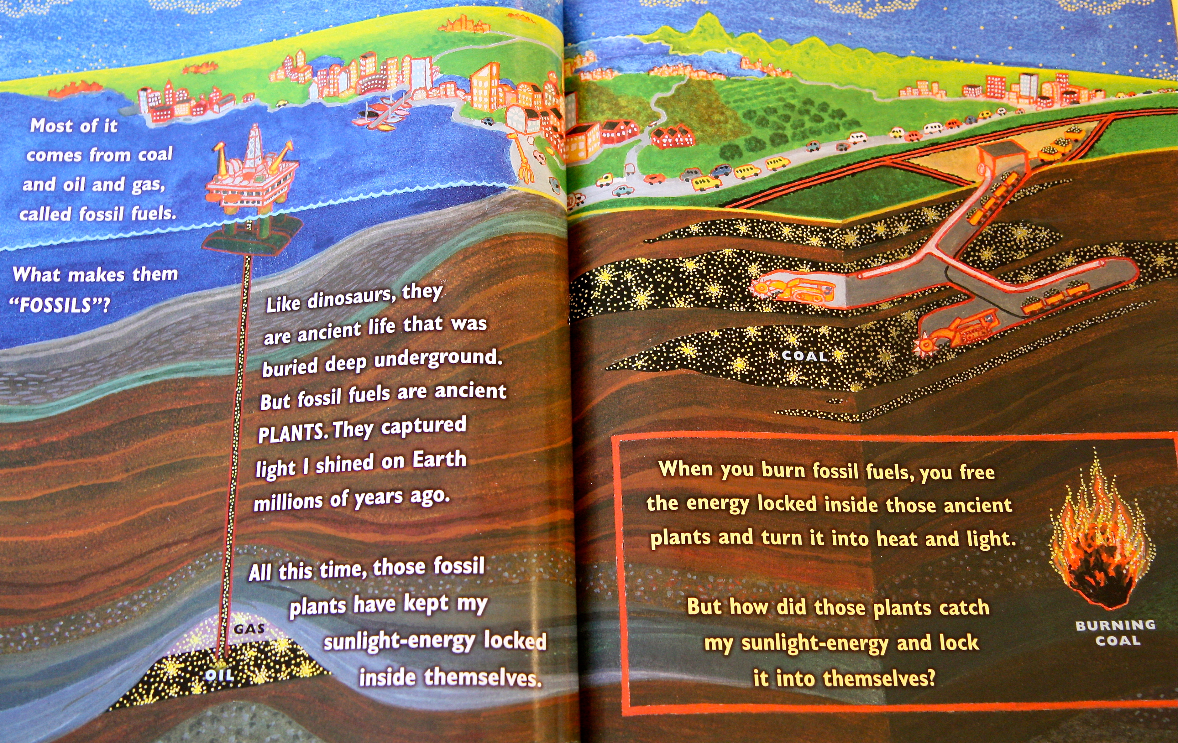 So, when I read Buried Sunlight: How Fossil Fuels Have Changed the Earth (Ages 6-12), the latest offering in Molly Bang and Penny Chisholm’s fascinating Sunlight Series, I was squirming with excitement to have all the right words and all the right pictures to explain global warming. And to understand it finally myself! If you’re not familiar with this luminescent and poetic picture book series about the relationship between sunlight and energy—collaboratively written by an ecology professor (Chisholm) and a children’s author-illustrator (Bang)—this is the fourth title. Invoking the sun as narrator, My Light describes how sunlight is transformed into electricity; Living Sunlight: How Plants Bring the Earth to Life goes on to offer the most accessible explanation of photosynthesis I’ve ever encountered; and Ocean Sunlight: How Tiny Plants Feed the Seas reveals the sun’s vital role in sustaining the life cycles and food chains in our oceans. Now, with Buried Sunlight, we are introduced to fossil fuels: how they were created millions of years ago, how they work, and the effects on our planet of burning them today.