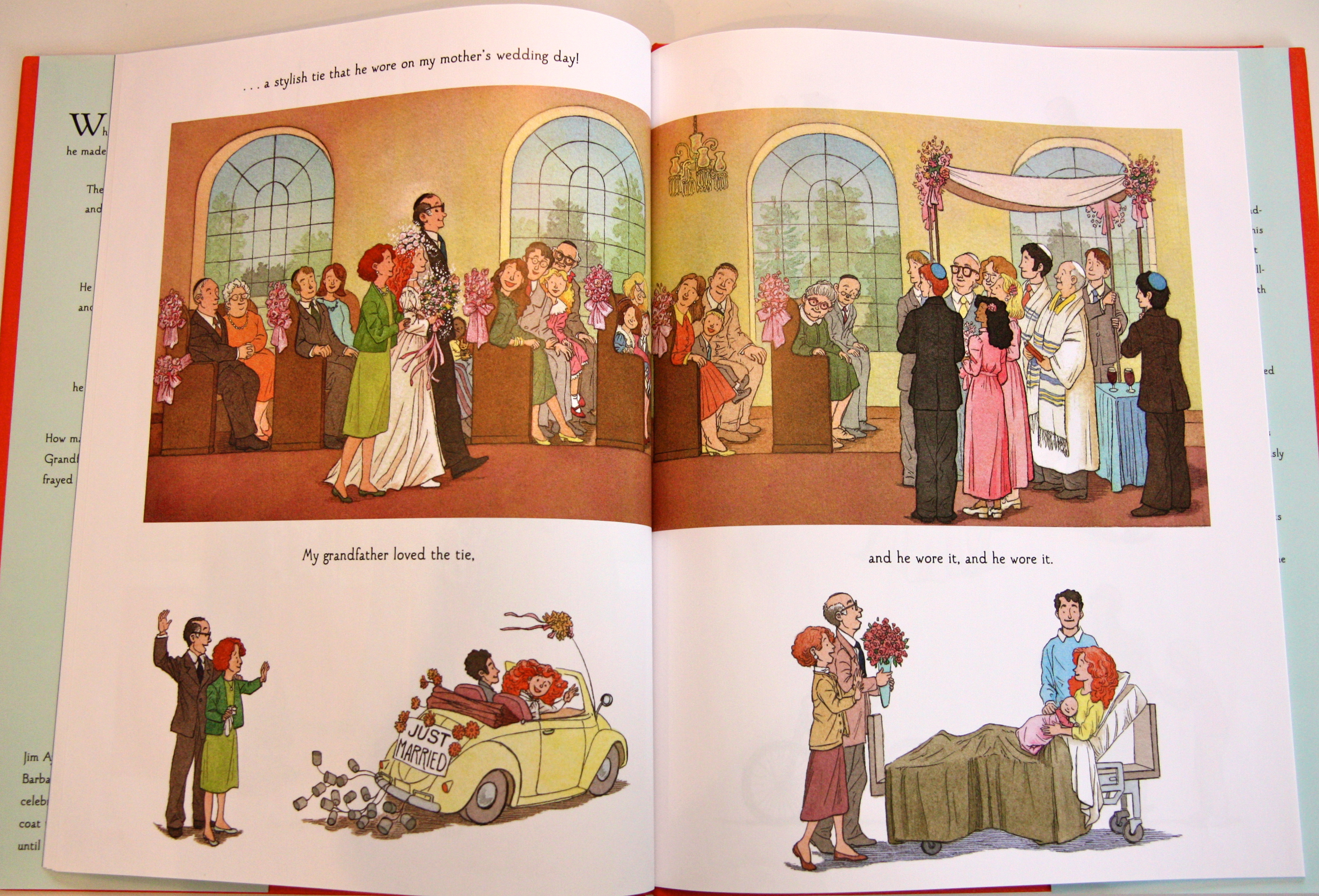 The unifying thread is a handsome navy blue coat, which, in preparation for his wedding day, the grandfather “snipped, and he clipped, and he stitched, and he sewed.”