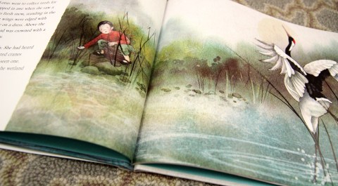 The sudden appearance of the endangered and regal crane in the desolate landscape—its “long, curved neck…crowned with a red top like a dazzling ruby”—is at once identified as a sign of hope and beauty to the sorrowful little girl, although we do not yet know just how important this gift will be. What we do understand is that Lotus’ silent exterior belies a feisty spirit: when she hears the gunshot and watches a poacher descend upon the injured bird, she makes “a noise like thunder” by drumming on her metal pail with a reed cutter. The poacher flees, and Lotus gathers up the bleeding bird and carries her home to her grandfather. (With each reading, my children seem to linger longer over the picture of the crane’s tragically listless body draped over Lotus’ arm).