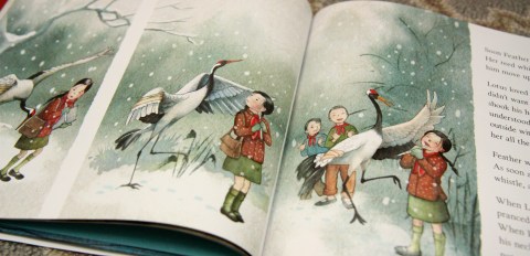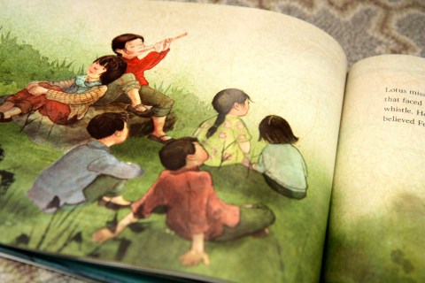 Perhaps I am a glutton for punishment because I relish reading aloud books like The Lion and the Bird and A Letter for Leo, which have similar character-adopts-struggling-animal-and-later-releases-animal-back-into-the-wild plots and always, always make me cry. Or perhaps I want my children to be as intrigued as I am by what is left when the animal is gone. Lotus misses her friend terribly, but she is no longer the isolated girl she was before Feather came into her life. One of the final spreads shows Lotus playing her reed whistle among a small group of children, one of whom is leaning affectionately against her. Choosing and working to save Feather may have been adventurous, it may have felt right, but it accomplished something even greater: it cast Lotus in the center of her own story.