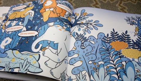 The joke’s on the mamas (although older children will quickly realize they’ve been in on it the whole time), because the presupposed sleepy little leopard, panda, orangutan, and elephant are in fact frolicking, singing, and marching about with wild abandon. Even more, when they hear the STOMP STOMP STOMP STOMP of their mamas, the young animals quickly sneak off under giant banyan leaves, take playful plunges into the nearby water hole, and then don feathered disguises.