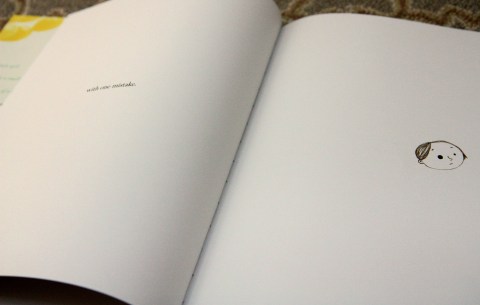Opposite the story’s opening words, “It started,” is a partial line drawing of a face—much like a child herself would do. In this face, only one eye has so far been drawn. Turning the page reveals the second half of the sentence, “with one mistake,” as it does the addition of a second eye. What is the mistake? It didn’t take long for my children to point out that the second eye has been dawn larger than the first.