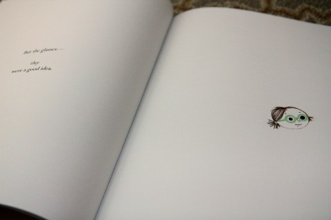 When we turn the page a third time, we begin to witness the magic which happens when an artist takes back creative control. “But the glasses—they were a good idea.” The artist has added a pair of wide-rimmed, seafoam-colored glasses around the eyes, intentionally detracting from their oddness.