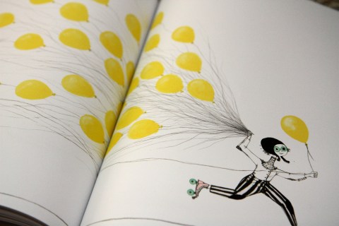 With each turn of the page, new mistakes give way to new ideas. An extra-long neck and anatomically-challenged elbows are obscured with an Elizabethean-style collar some elbow patches. The awkward space between the girl’s feet and the ground suddenly makes sense with the addition of roller skates. Ink smears become feathers. Stray pencil marks become strings for brilliant yellow balloons, which our roller skater suddenly holds up with great purpose. Bit by bit, a story line begins to unfold.