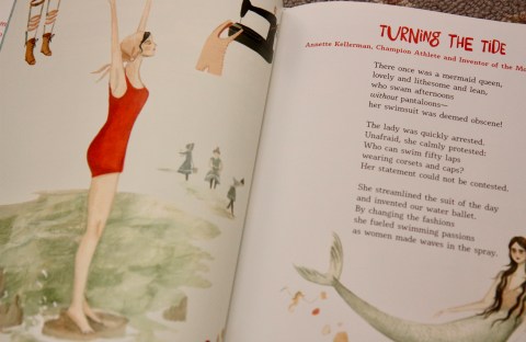 Tantalizing content aside, what makes this book stand apart in an increasingly popular genre of biography anthologies is its unconventional format, perfectly suited to its unconventional heroines. Susan Hood profiles the fourteen young women, not through traditional prose, but with playful and lyrical poems. She even chooses different poetic forms to represent the distinct personalities she seeks to bring to life. For Mary Anning, Hood creates a concrete poem in the shape of the ichthyosaur fossil, Anning’s signature discovery. Pura Belpre, the first Latina librarian at the New York Public Library, appropriately gets an acrostic poem, where the first letter of each line creates the full alphabet.