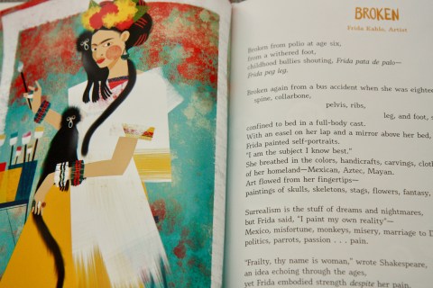 But wait, there’s more! As you’ve undoubtedly noticed by now, each of the thirteen poems (one poem covers two women) is accompanied by a portrait of the subject created by a different well-known children’s illustrator, including favorites like Melissa Sweet, Julie Morstad, LeUyen Pham, and Emily Winfield Martin. In a book celebrating a range of possibilities for women, we are also privy to a diversity of female artistic styles and expression, rendered in paint, crayon, pencil, and mixed-media collage. Take, for example, Erin K. Robinson’s vibrant palette surrounding the stoic face of Frida Kahlo (“I am broken. But I am happy to be alive as long as I can paint.”):