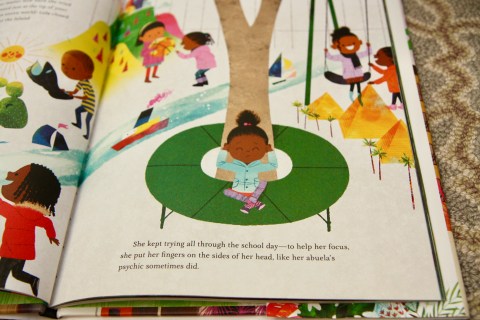Lola knows her family is from “The Island,” but she left there before she could make any lasting memories of her own. Dalia instantly announces she is going to draw pyramids; Matteo remembers a “desert so hot even the cactus fainted”; and Nelson—normally so distracted he has forgotten his name on occasion!—is already hard at work constructing a mongoose. Lola sits on the playground amidst all the chatter, channeling her “Abuela’s psychic”: she closes her eyes and puts her fingers on the sides of her head. Nothing comes.