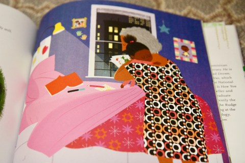 Just because Islandborn’s illustrations are front and center doesn’t mean the narration is any less lovely. Junot Diaz has long been considered a master of language; and the lyricism in his debut picture book—an Island so alive it feels like “the inside of a drum”—is beautifully and perfectly suited to a child audience. Even more, Diaz crafts a young heroine whose curiosity, thoughtfulness, and persistence eventually make everyone around her share a piece of themselves. Lola not only celebrates their shared heritage, but she herself grows in poise and self-awareness through these exchanges. A man in the barber chair tell her about Island mangoes the “size of your head.”