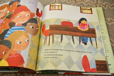 While the second-person narrative is intended to address anyone who feels set apart—due to physical appearance, heritage, religion, socio-economic background, or something less tangible—four racially-diverse children feature throughout the book and lend some specific examples. One is intimidated by her classmates’ tales about the exotic vacations they took during summer break, since she spent her days caring for her little sister in their hot city apartment (“what good is this/ when other students were flying/ and sailing and/ going somewhere”).