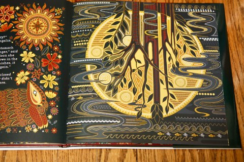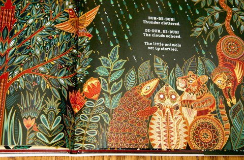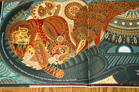 Both of my children are older than the intended audience of this book, but I bought it anyway—and not just for its calming tone. The metaphorical language attached to wind, thunder, lightning, and flooding is beautiful. And the geometrically intricate illustrations—inspired by folkloric Indian art—are positively stunning. An extraordinary reminder that we are never too old for picture books.