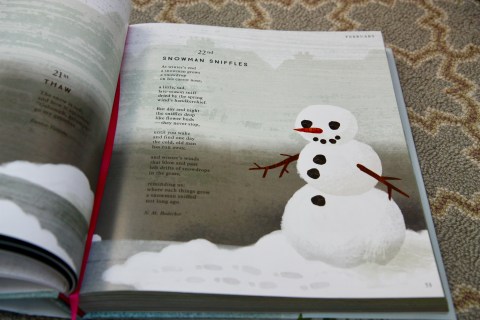 We can start our mornings with the likes of Emily Dickinson, Langston Hughes, Jack Prelutsky, Ogden Nash, William Shakespeare, Kanoko Okamoto, and dozens of others (don’t forget the elusive Anonymous). An impressive array of poetic forms and styles are represented. Like the sun that’s out one day and gone the next, the tones shift between silly and stilled, provocative and peaceful. There are plenty we already know and have long wanted to introduce to our children (Robert Frost’s “Stopping by Woods on a Snowy Evening” makes an early appearance on January 6) and many more waiting for us to discover together with our children (I heart the beginning of N.M. Bodecker’s “Snowman Sniffles”: “At winter’s end/ a snowman grows/ a snowdrop/ on his carrot nose[…]”).