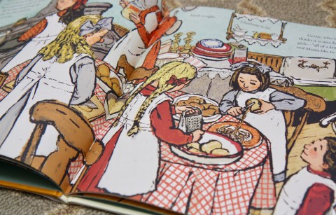 We can hardly blame Gertie for feeling left out of such collaboration and festivity. Plus, the taste and smells evoked are every bit as mouth-watering as they are in the original books, from the “salty” chicken to the “sweet” applesauce to the “crispy” potatoes.