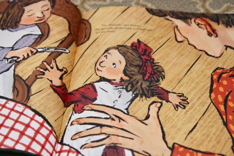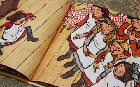 The five sisters—Ella, Henny, Sarah, Charlotte, and Gertie—range in age from twelve to four; and no finer example of sibling affection will you find. But, because reading about perfect children is supremely dull, the gift of Taylor’s original books has always lain in the not-so-perfect moments, the times when the girls grow grumpy and irritable and don’t want to be models of helpfulness and patience. All-of-a-Kind Family Hanukkah is filled with just such moments, from Henny giving Gertie the side eye on the cover, to Gertie’s full-fledged temper tantrum halfway through the story.