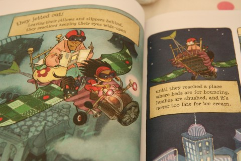 In Stop That Yawn! (Ages 4-7), written by Caron Levis and illustrated by LeUyen Pham, our young protagonist takes her grandmother on a raucous, riotous romp to Never Sleeping City, in an effort to ward off sleepiness. (“Gabby Wild had had enough of bedtime. Yawn, curl, snuggle, snore—what a bore!”) The two don driving goggles and, with Gabby at the wheel of a flying bed (think Chitty Chitty Bang Bang, with wings and a propeller), they “jetted out,” determined not to stop “until they reached a place where beds are for bouncing, hushes are shushed, and it’s never too late for ice cream.”