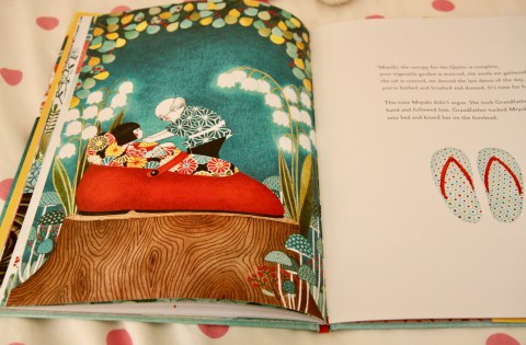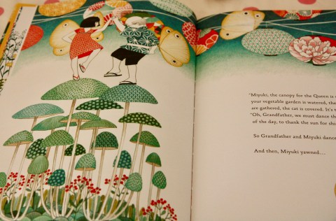 What Miyuki has to do before settling in for the night is to create order and harmony in her natural surroundings. For one, the Dragonfly Queen is coming to visit tomorrow (“it’s a very big deal”), and a canopy must be made “to honor her, there, under the cherry tree.” Two, her garden of oversized radishes and carrots must be watered. Three, a family of snails must be led home. Four, a blanket must be knit for the cat. Grandfather patiently helps Miyuki with each of these tasks, braiding poppy stems and leading snail parades, before asking if she might finally be ready for bed.