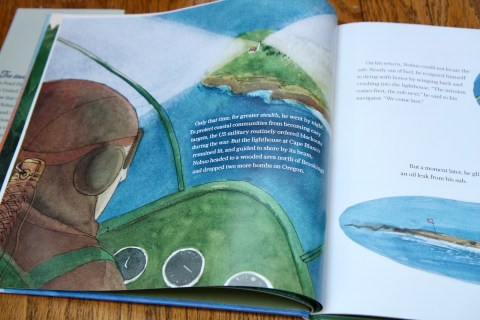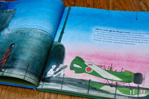 What sucked my son in was the promise of warfare, which the story initially delivers on, giving a fascinating account of the only two times the United States’ mainland was bombed during WW2, both times by Japanese bomber pilot Nobuo Fujita, during a covert mission off a submarine in 1942. Say what?! Why have I never heard about this? That’s because the bombs did very little damage. Dropped over a large forested area outside the town of Brookings, Oregon, the bombs were intended to start a large fire which would then spread to nearby towns—only the ground was too wet for the flames and smoke to catch. The greater danger befell Nobuo himself, who almost couldn’t locate the sub on his way back from the second bombing and nearly ran out of fuel in the air.