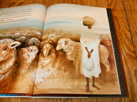 When she is eleven, Isabella is sold “for a hundred dollars—along with a flock of sheep” and never sees her mother again. Here, her body is painted with an almost ghost-like transparency against the brown, dusty background. And yet, her head is erect, her profile distinguished, as it is throughout much of the book—a nod to her mother, who encouraged Isabella to keep her gaze on the stars and the moon, under which her family would always be together. “Those are the same stars, and that is the same moon, that look down upon your brothers and sisters.”