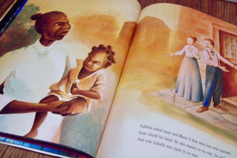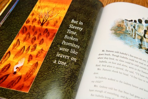 Isabella takes her emancipation into her own hands after Mr. Dumont refuses to honor his promise to free her a year before all slaves in New York were required to be freed by law. “…[T]he summer came and the summer passed. ‘Oh,’ thought Isabella, ‘I have felt as if I could not live.’ So that fall, after the work of the harvest was done, she held baby Sophia close and seized Freedom with her own hands.” She takes refuge with a white couple, who protect her and pay Mr. Dumont for her release when he eventually tracks her down.