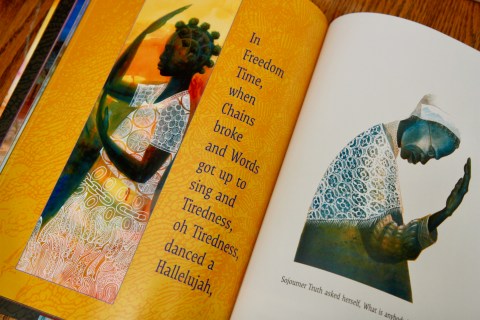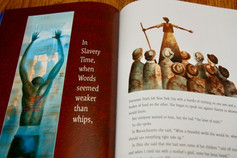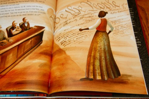 I asked my eleven year old to pick a word to describe this book. “Intriguing,” he said. He is spot on. So Tall Within is a prime example of a picture book biography targeted at the older elementary child. A book with layers of meaning. A book well researched, offering occasional citations from some of Sojourner’s own writings and speeches. A book whose illustrations invite endless discussion. A book which should be allowed to take up space of its own.