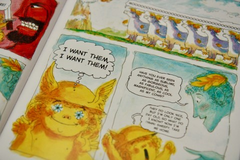 Emily wasn’t one page into the book when she was already giggling. “What’s so funny?” I asked. “Look,” she said, bringing the book over to me. “Hermes’ first word is GIMME.” Yes, Hermes comes into the world—at least, by his own telling—with an insatiable appetite, not afraid to use any amount of golden-curled charm to get what he wants. Intrigued by a turtle’s shell, Hermes convinces the animal it “hides your personality,” then takes it for himself. Combining the turtle shell with the horns he talks off a goat, Hermes invents the lyre, “the world’s first musical instrument.” With dimples and music in his toolbox, Hermes goes on to woo his older brother Apollo’s “herd of crumple-horned cows” out from underneath him.