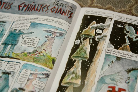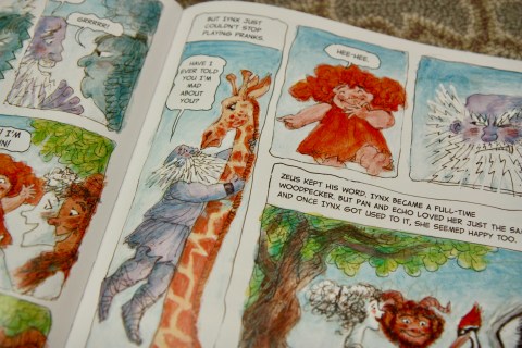 It seemed only fair to allow Emily first dibs at Gerstein’s second “mythological memoir,” seeing as his first—I am Pan!—remains one of her favorite books ever (the god of noise and confusion getting into his own share of trouble). Whereas my son relishes the complexity, nuance, and darkness of George O’Connor’s formidable Olympians series, Emily likes her mythological re-tellings on the irreverent side. She’s in it for the spectacle. As Gerstein himself points out in his latest Afterward, when you start stripping Greek gods down to their silly, jealous, bad-tempered egos, you get something resembling a “family sitcom.” Emily has her popcorn at the ready.