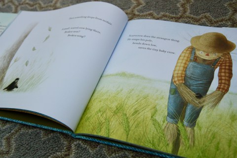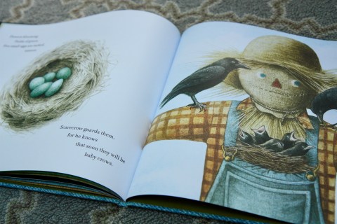 Scarecrow’s joy is tangible, as the crow announces he is back to stay and quickly offers new purpose to Scarecrow’s life. Rather than standing guard against an unknown enemy, Scarecrow will now stand guard over five eggs tucked inside a newly-made nest in his overall pocket. He will guard his found family, and in return their companionship will lighten his load, as he squares off against the elements, season after season.