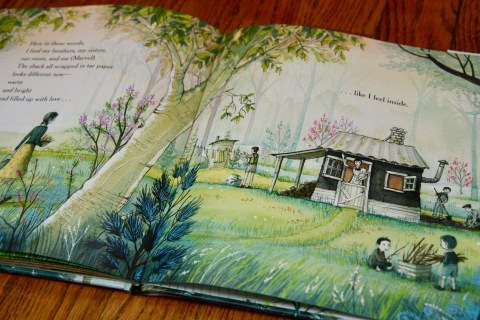 This subtle introduction of color and detail into the illustrations—visual evidence of the family’s quiet emotional transformation—continues throughout the book. Before they feel any real warmth towards the tiny shack, though, the children begin to explore and delight in the wild nature around them. Rain falls like “crystals,” aiding the seeds the family has brought with them from their former home. The “secret paths of whitetail deer” reveal themselves to the children as they run through the trees. When the children collapse in a “blooming berry patch,” their bellies full of the “sweet jewels of blue and red” and their “laughter echo[ing] through the trees,” we begin to see Mum’s optimism taking root.