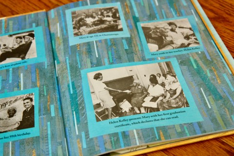 My daughter especially loves the pages which follow, dedicated to the well-deserved fanfare Mary’s achievements bring her, including a visit from the Chattanooga mayor and President Lyndon B. Johnson; interviews with newspaper reporters and radio shows; a graduation certificate; various plaques and two Keys to the City; and yearly birthday parties for the next seven years, during which Mary reads aloud favorite passages from her Bible or schoolbook “in a voice clear and strong.” That’s right: she lived until she was 121. (I have to admit: I actually didn’t realize anyone lived that long.)
