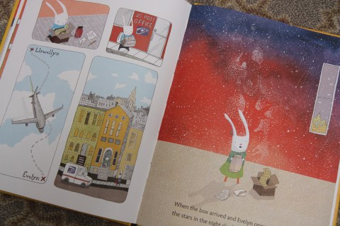On the one hand, this seems simple enough, perhaps even something we have watched our own children do. But this isn’t a literal story, and Llewellyn himself is anything but ordinary. Llewellyn fits a lot more into his jars than physical treasures. The first night he meets Evelyn, he scoops up lake water in a jar—glowing “tart cherry syrup” from the setting sun—and offers it to the other bunny. “And to her surprise, it glowed through the night with the memory of that sunset.”