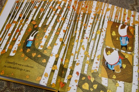 “Llewellyn was a collector. He collected things in jars.” (The name Llewellyn also had me from the start. Can you think of a book with a character named Llewellyn? No, you cannot. And it’s infinitely fun to pronounce.) This tall-eared, anthropomorphized bunny is what we hope for in our own children: he’s a Great Observer of the world. As he ventures beyond his home, he is forever collecting physical reminders of his days: the leaves which rain down around him; feathers and shells; a heart-shaped stone. “When he held a jar and peered inside, Llewellyn remembered all the wonderful things he had seen and done.”