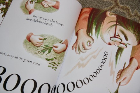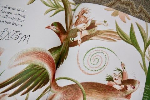 Julie Fogliano and Jillian Tamaki’s my best friend (Ages 3-7) came out only a week ago, but so enthusiastic has the response been from the kid lit world, I feel like the last person to sing its praises. (Still, wild horses couldn’t keep me from joining in the fun.) An homage to the giddy abandon exhibited in early childhood friendships—particularly those born on the playground—the book has all the makings of a classic. Fogliano’s free verse sings and soars with the stream of consciousness of a child tasting the deliciousness of friendship for the first time. (i have a new friend/ and her hair is black/ and it shines/ and it shines/ and she always laughs at everything) Tamaki’s muted palette of rusty pink and olive green lends the book a timeless, vintage feel, while the figures themselves spill and explode off the page, their excitement literally uncontainable.