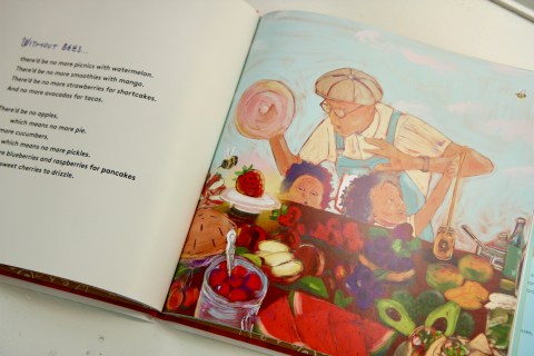 But where there is fear, there can also be love. As much as we might wish bees would pack up and move away, “if they were gone, it would hurt much worse.” The next spread supposes what a world without bees would look like: “no more picnics with watermelon,” “no more avocados for tacos,” “no more strawberries for shortcakes.” Without bees, we wouldn’t have the apples for apple pie or the cucumbers for pickling. Again, the language pulls straight from a child’s world.