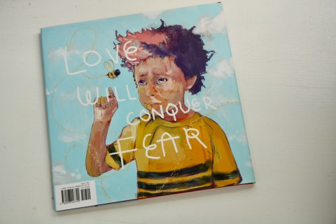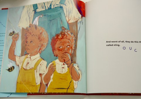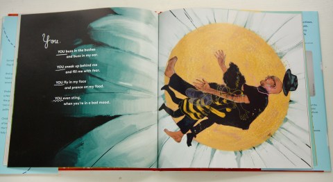 I love Larkin’s mixed-media collages, the movement he brings to his illustrations with loose brushwork and hand lettering and layered colors. I love his beautiful brown-skinned family, depicted with such playfulness and physical affection. I love that, most of the time, he looks more frightened in the presence of bees than his honey-licking children. I love that he has given us parents a script to use with young children fearful of bees, one I feel certain would have helped my own child once upon a time. I love that this is a book about what happens when love triumphs over fear. And how delicious that tastes.