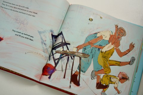 But here’s “the thing about bees,” the book continues, shifting to reveal illustrations of a father at play outside with his two sons: