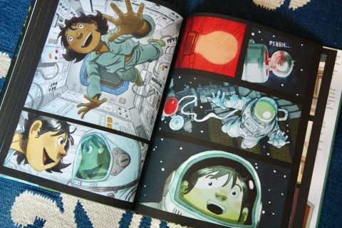 Once the lights are out, Iris channels her anger into another adventure aboard the magical lift behind her closet door. This time, influenced by the board game she played earlier with the babysitter, the destination is Outer Space. Suited up in an astronaut’s gear, Iris floats inside and outside a massive space station, eyes wild with excitement, arms outstretched, no one around to compete with.