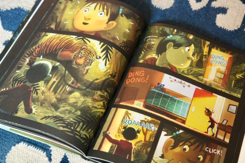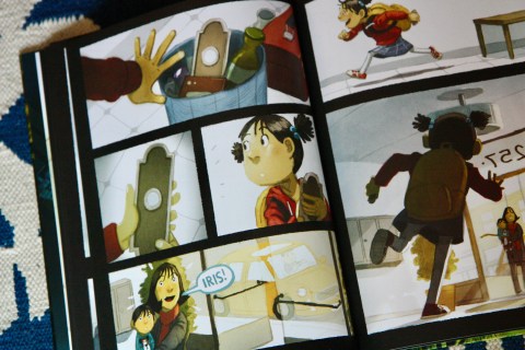 Iris’ jungle adventure, including roaring tigers, doesn’t last long, because the apartment’s (real) doorbell sounds and draws Iris back to her room and into the front hall, the only signs of what has just happened a stray leaf in her hair. (Careful readers will note the connection between the tiger in Iris’ adventure and the stuffed tiger carried by her brother throughout the story, the word “Iris” inscribed in black sharpie, reminding us that this is one more in a long line of things usurped by the family’s newest arrival.)