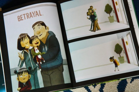 Iris loves to push the elevator buttons in the apartment building where she lives with her parents and younger brother. “When I’m feeling a bit down, there’s one thing that always cheers me up.” Breaking with traditional picture book format, Lift is Minh Lê and Dan Santat’s second picture book together (the first was this), and the beauty of their partnership lies in their seamless, cinematic blending of words and illustrations, of telling and showing. In this instance, we don’t need to be told why pushing elevator buttons cheers up our young protagonist, because the picture is worth a thousand words: Iris’ face, previously a scowl shadowed by her family, is now lit with the light of the button, her family no longer visible in the frame. It’s a private moment. It’s a powerful moment. It’s a look-what-I-can-make-happen moment.