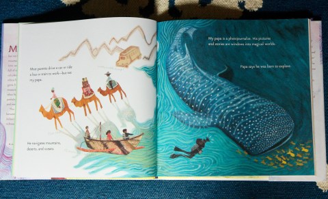 Despite tears at her father’s departure, Lulu explains with pride: “Most parents drive a car or ride a bus or train to work—but not my papa. He navigates mountains, deserts, and oceans. My papa is a photojournalist. His pictures and stories are windows into magical worlds. Papa says he was born to explore.”