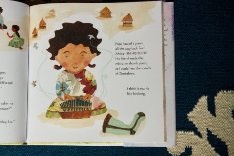 No matter where Papa goes—and a whopping 25 countries are alluded to by the end of the book (the final page charts them all on a world map)—he returns with keepsakes for his family, little windows into the fascinating cultures he has experienced. His pockets never fail to bring back “treasure troves of silver and gold,” and Lulu’s favorites are the coins with holes through the center. But Papa brings back larger items, too, like an abacus, or “ancient calculator,” from China, which Lulu and her mother use to count the stars as they wait for Papa’s next return; a mbira, or “thumb piano,” from Zimbabwe; and a “driftwood dragon” scavenged from a beach on the Irish Sea.