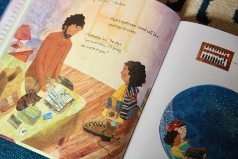 One of the many gifts of Papa Brings Me the World is the message that you don’t have to travel in person to different corners of the world to glean insights into what life might be like there—or even to discover commonalities. Papa teaches Lulu a game he learned from children in Sumatra, a variation of “Rock, Paper, Scissors” involving an ant, a person, and an elephant; and he sets up a pen pal for her while he’s in Mexico (“he sent me a new friend in the mail!”).