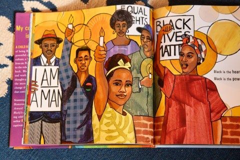 “My color is black” begins to build in momentum, as the girl launches into examples of uprising. One spread depicts stained glass windows of the four women founders of the modern Civil Rights Movement, while another references MLK Jr.’s “I have a Dream” speech. Still another showcases a “Black Lives Matter” rally. “Black is the heart of a candle and flame./ Black is the power of movement in pain.”