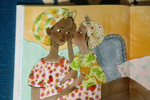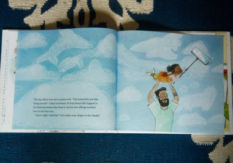 Aidan’s parents continue to demonstrate their love and acceptance for their firstborn in the creative license they give him in the months and weeks leading up to the new baby’s arrival. The father holds his son up high so he can paint cloud forms on the baby’s ceiling. With pointed toes, an arched back, and blissed-out eyes, Aidan looks positively enraptured by his father’s love and his hope for their family. “[Aidan] had always felt trapped in his bedroom before they fixed it, but his new sibling wouldn’t have to feel that way.”