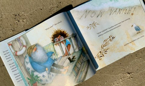 For the next few pages, the story’s rhythm mimics the back-and-forth movement of the tides themselves: the girl and her granny invite Swashby to tea or to make sandcastles, while Swashby grumbles and mumbles and hides himself away, all the while leaving messages in the sand (PLEASE GO AWAY) for the sea to tamper with (PL-AY). Lest she gets the wrong idea, Swashby takes every chance to remind the girl that “Swashbys don’t play”—even though his interference suggests he may be quite an expert on the subject (“It’s the clam shells ye should be usin,” he calls out, when he decides the girl’s sandcastles are too plain).