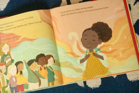 When the teacher gets to our girl’s name, she hesitates and frowns, just like the day before. We know the girl’s moment has arrived, and she rises to the occasion. She sings. But she doesn’t just sing her name. She sings the name of her teacher and the names of her classmates. She even draws out the monosyllabic name Bob with a “BAW-AW-AW-AWBB!”, which makes my daughter laugh with delight every time. The children in the story love hearing their names sung. And they love hearing the girl’s name sung. They want to try it out, they want to get it right, this twelve-letter hyphenated name with Mandinka and West African origins. They want to embrace this girl as one of their own.