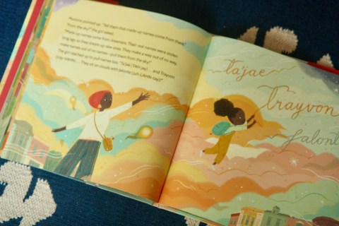 Finally, the girl wants to know how she should respond when kids say her name sounds “made up.” Here, the mother points to the sky to invoke the connection between names and ancestry. Some names are made up, she attests, because long ago their ancestors’ “real names were stolen…so they dream[t] up new ones.” Made-up names are powerful because they reclaim an agency once lost. They’re pulled straight from the stars. (A guide at the back of the book cites the origin and meaning of each of the twenty-five names mentioned in the story.)